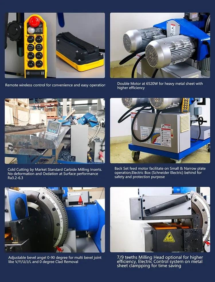 7) High efficiency beveling speed reach 0.4~1.2 meters per min. 8) Automatic Clamping system and hand wheel setting for slight adjustment.